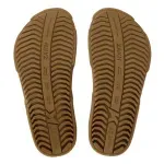 Palmilha lixada de EVA expandido na cor crepe, com arte em laser e transfer, e peças tapa areia injetadas, projetadas para vedar o espaço entre a tira e a palmilha, dando acabamento e evitando a entrada de detritos