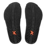 Palmilha lixada de EVA expandido na cor preta, com arte em laser e transfer, e peças tapa areia injetadas, projetadas para vedar o espaço entre a tira e a palmilha, dando acabamento e evitando a entrada de detritos